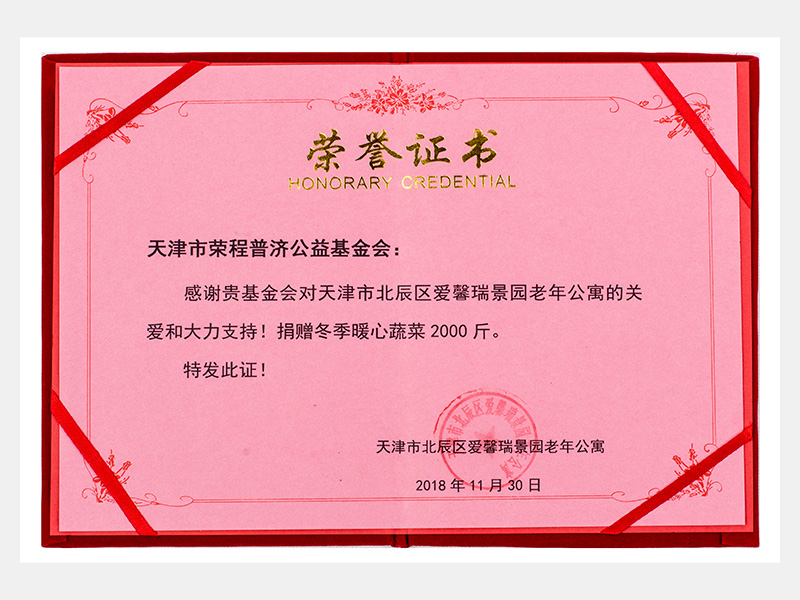 “購滯銷蔬菜捐贈養老院福利院活動”愛馨瑞景園老年公寓捐贈冬季暖心蔬菜2000斤榮譽證書(慈善)