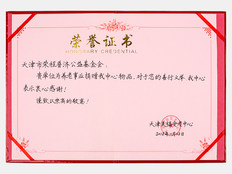 “購滯銷蔬菜捐贈養老院福利院活動”天津美福安老中心榮譽證書(慈善)