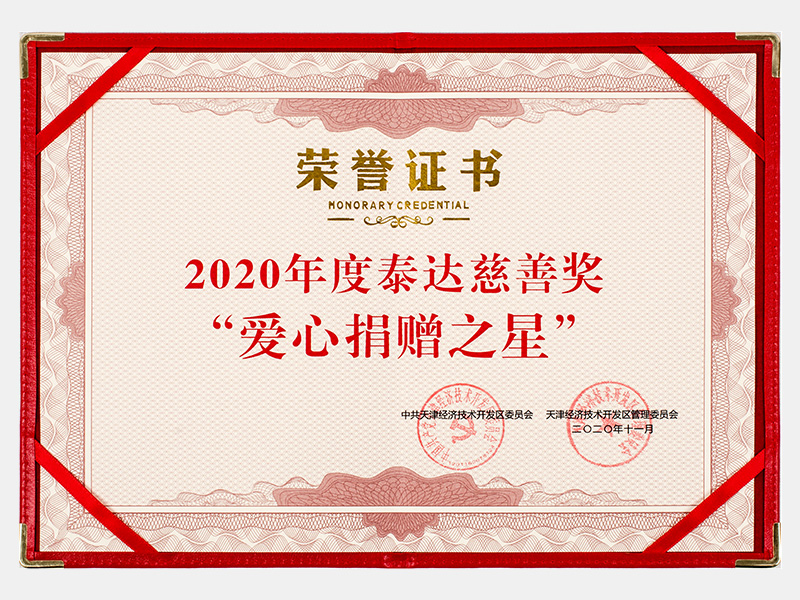 2020年度泰達慈善獎“愛心捐贈之星”證書