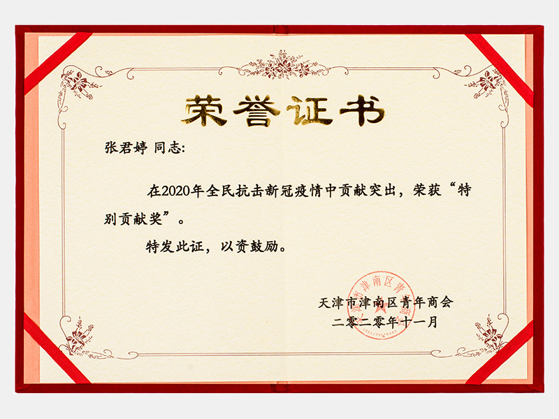 在2020年全民抗擊新冠疫情中貢獻突出,榮獲“特別貢獻獎”證書